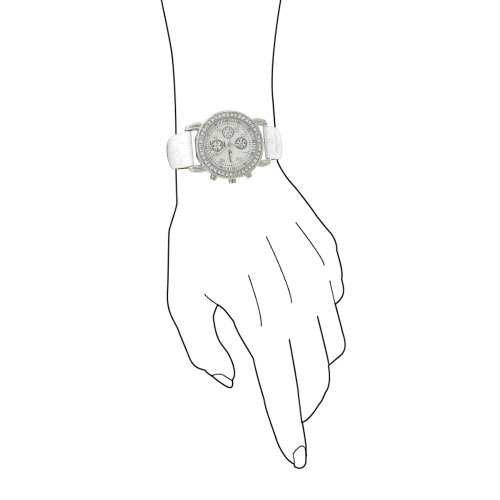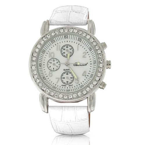 Dare to add a little sparkle to your look with this paved encrusted czs bezel, white genuine leather strap watch with buckle clasp. This chronograph allows you to read minutes, seconds, and military time, it's glow in the dark hour hands will allow you to read time day or night. Coordinate this watch with any ensemble from business casual to everyday wear.