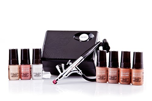 Beauty is in the air with luminess air's basic airbrush system. Reveal skins natural beauty with our dermatologist tested and recommended airbrush system that helps eliminate cross contamination resulting in healthier looking skin. This revolutionary airbrush system allows for easy, quick and long lasting applications of airbrush foundation, blush, primers, skincare , eyeshadows, and much more. Luminess air's specially formulated foundation allows you to spray away a verity of unwanted imperfections such as acne, discoloration, dark circles, bruising, varicose veins, scars, wrinkles, tattoos, and more. Our makeup allows skin to breathe without sacrificing coverage-airbrushing with luminess air gives sheer to ultra-coverage minus the appearance of heavy or cakey makeup. This system come with a guaranteed 8 piece color match starter kit giving you everything needed to create a flawless, camera ready look from head to toe. Available in light, medium and dark skin tone packages. Makeup kit includes: Basic Airbrush Compressor and TechnIQue No Mess Tip Stylus AC Adaptor 1 Year Warranty 4 – 0.55oz bottles Ultra foundation 1 – 0.25oz Blush 1 – 0.25oz Skin Brightening Glow 1 – 0.25oz Moisturizer/PrimerFeature