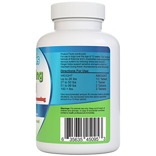 ALL NATURAL: Prescription calming aids, like sedatives and tranquilizers, knock your dog out, are addictive, and dangerous. Do not submit your pooch to harsh drugs that could easily put his life at risk, instead why not try an all natural calming aid. Contains Chamomile Flower, Passion Flower Extract, Ginger, Thiamine Mononitrate, and L Tryptophan to promote a calm, worry-free disposition in your canine.