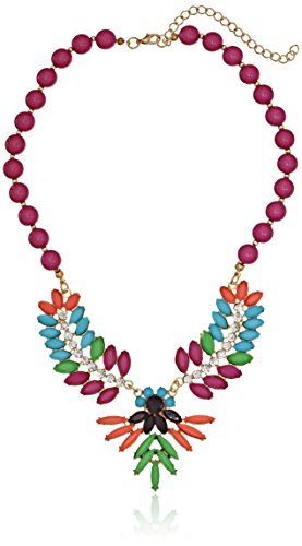 -. Feature : Colorful statement necklace featuring bead and crystal bib suspended from strand of large round beads / Lobster-claw clasp / Imported