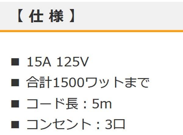 プラグにはトラッキング防止カバーが付いていて安心です。コードは、導線の二重被ふくで強度を強化しました。 生産国:中国 ※サプライヤー直送品 ご注文後2~3営業日後の出荷となります【商品名】OHM 3個口タップ 5m HS-T1984W