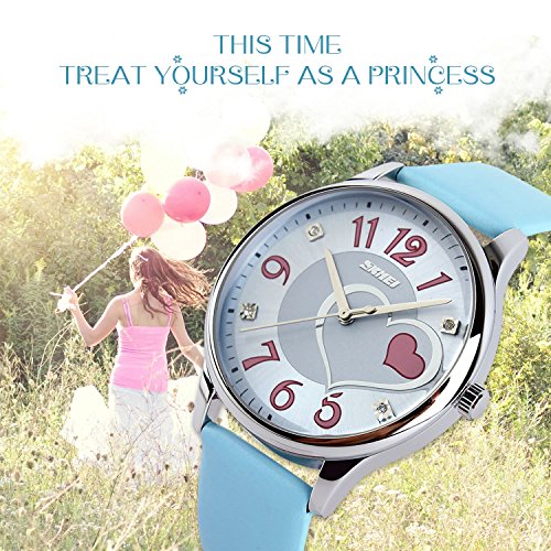 "Highlights: • Special Dial Design with Hearts, Rhinestones and Cute Arabic Numerals On It • Imported Quartz Movement provides precise and accurate time keeping • Key Scratch Resistant Watch Face • Comfortable Leather Band Strap • Stainless Steel Durable Waterproof Case Cover, Not Easy To Fade • 98FT / 30M Water Resistant - Daily Use Waterproof, Hand Wash, Rain Day, Sweating. (Please DONOT PULL OUT the button under water) • Classic Fashion Casual Dress Watch Design. Combines Quality, Leading Edge Fashion, and Value • Great and Romantic Gift for Your Friends Features • Key Scratch Resistant Watch Face • 98FT / 30M Waterproof • Leather Band Strap Material: • Case Material: Stainless Steel • Band Material: Leather • Mirror Surface: Mineral Glass (Key Scratch Resistant) Specification: • Dial Case Diameter: 1.50 inch / 3.8 cm • Dial Case Thickness: 0.47 inch / 1.2 cm • Band Color: Blue • Band Width: 0.75 inch / 1.9 cm • Band Length: 9.06 inch / 23 cm • Max Fit Wrist: 8.07 inch / 20.5 cm • Min Fit Wrist: 6.30 inch / 16 cm • Band Clasp Type: Double Locking Fold Over Clasp • Watch Weight: 1.41 oz / 40 g **NOTE**: • Please DONOT PULL OUT the Button Underwater. Use in extreme Hot or Cold temperature will damage the leather band and shorter watch life. • If mist or droplets found inside watch surface, please contact manufacturer immediately. • Clean the strap by a soft cloth on regular bases is highly recommended. • Too much water contact will damage the leather band and shorter watch life. What Is In The Package: • Women Leather Band Fashion Casual Dress Watch x 1Feature