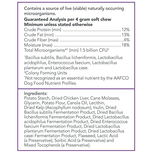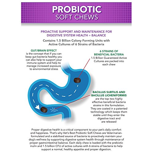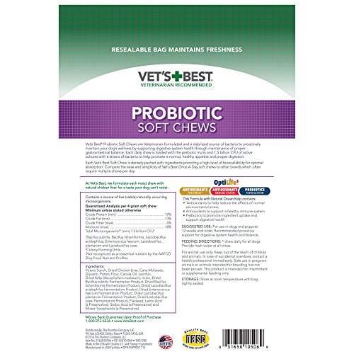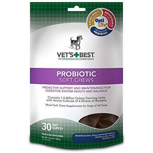 -. Binding : Misc. -. Brand : Vet's Best -. EAN : 0031658105069 -. Feature : Vet's Best Probiotic Soft Chews (30ct) for dogs supports digestive health through proper gastrointestinal balance with a once-a-day supplement / Contains 1.5 Billion CFU with active cultures of 6 strains of bacteria - patented technology keeps chew stable until they reach the digestive tract / Made with OptiLife3* formula, a natural Ocean Kelp, provides Antioxidants and Prebotics to help support a healthy immune system and digestive health / Veterinarian-formulated and recommended - Probiotic soft chews supplement have a high level of bioavailability for optimal absorption and uptake / One (1) package contains 30 soft chew supplements - a 30 day supply for dogs and puppies (over 12 weeks old) -. Label : OUT! International -. Manufacturer : OUT! International -. Model : 3165810506 -. MPN : 3165810506 -. PackageQuantity : 1 -. PartNumber : 3165810506 -. ProductGroup : Pet Products -. ProductTypeName : PET_SUPPLIES -. Publisher : OUT! International -. Studio : OUT! International -. Title : Vet's Best 30 Count Probiotic Soft Chews Supplement for Dogs -. UPC : 031658105069