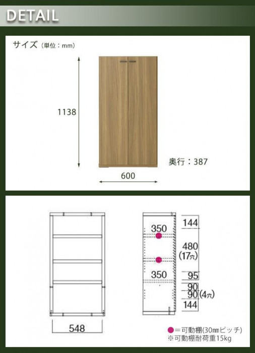 | 仕様 | 完成品(取っ手のみお客様取付) 可動棚板:2枚 可動棚板耐荷重:15kg(1枚あたり) |