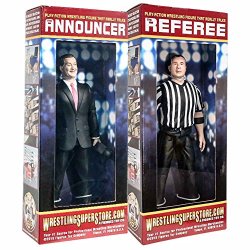 -. Binding : Toy -. EAN : 0744881530811 -. Feature : With each figure you can squeeze his legs together and they will throw their arm up and say five different sayings! / Each figure measures 7 inches tall and comes in cardboard packaging. / This goes great with your other wrestling action figures and accessories. / Each takes 3 LR44 watch batteries (included) -. IsAdultProduct : 0 -. Label : Figures Toy Company -. Manufacturer : Figures Toy Company -. PackageQuantity : 1 -. ProductGroup : Toy -. ProductTypeName : TOYS_AND_GAMES -. Publisher : Figures Toy Company -. Studio : Figures Toy Company -. Title : Special Deal: Talking Referee & Ring Announcer Wrestling Figures -. UPC : 744881530811