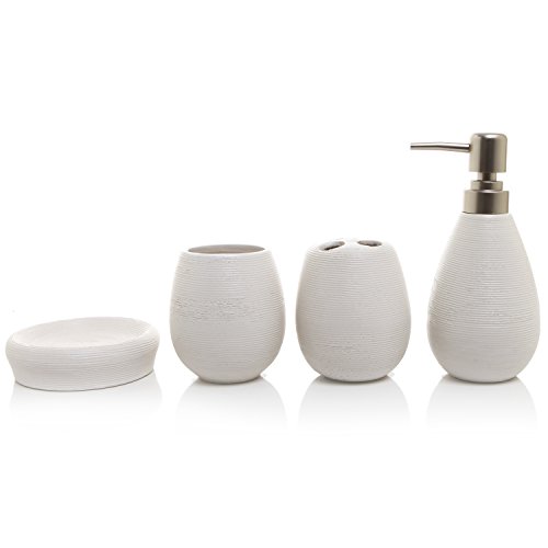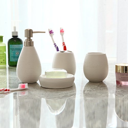-. Title : 4 Pc Line Textured Ceramic Soap Dish, Soap Dispenser, Toothbrush Holder & Tumbler Bathroom Accessory Set