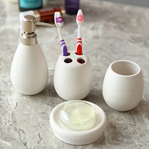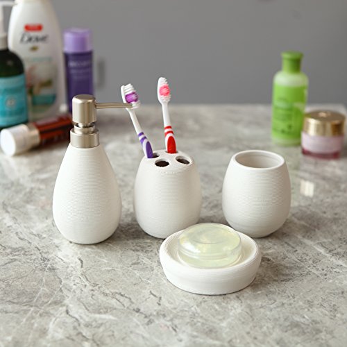 -. Feature : Contemporary deluxe ceramic 4 piece bathroom accessory set includes 1 round soap dish, 1 lotion/soap pump dispenser, 1 toothbrush holder (holds up to 4 toothbrushes), and 1 tumbler. / Gorgeous bathroom accessory features neutral colors that will compliment any bathroom theme. Also freshens up as a stylish accent. / Elegant contemporary design. Made of ceramic. / Perfect accessories set for master bath, guest bath or kids bath. Also suitable for commercial use. / Approximate Dimensions: soap dish - 1.25" H x 4.5" diameter ; soap / lotion pump dispenser - 7" H x 3" diameter; toothbrush holder - 4" H x 3" diameter; tumbler - 4" H x 3" diameter.