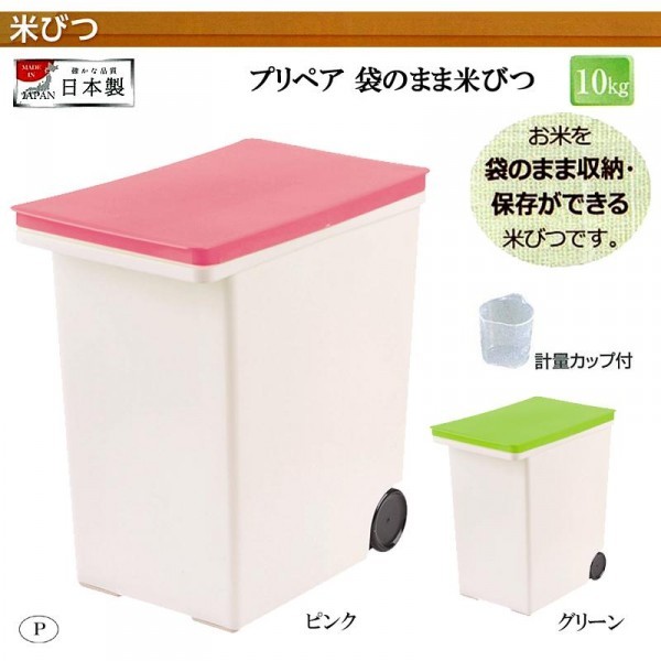 袋のまま収納・保存が出来るので衛生的です。引き出しやすい大型コロ付。計量カップ付。