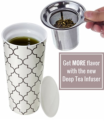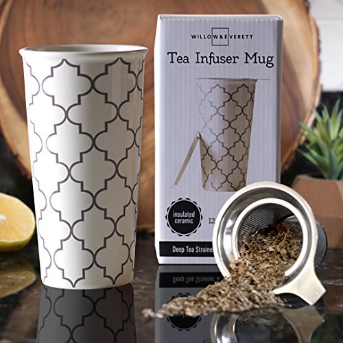 Studio : Willow Everett Publisher : Willow Everett Product Description Your 12oz ceramic travel tea mug holds more tea than smaller mugs and comes with a bonus silicone lid to help you transport your tea while you're on-the-go. The removable stainless steel infuser basket makes steeping loose tea easy. Simply add your favorite loose tea to the infuser, and pour boiling water over the basket then cover with the included ceramic lid to steep. When you reach your desired tea strength you are on your way to enjoying a generous 12oz cup of tea! 0