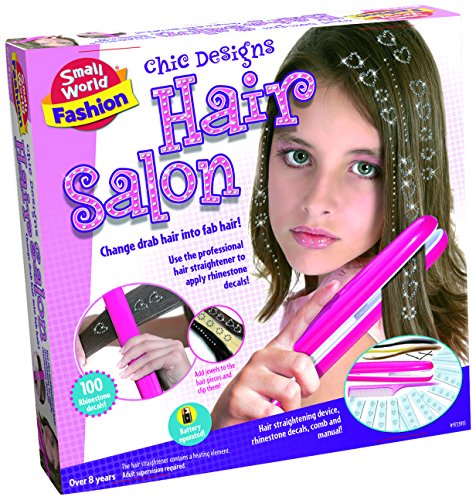 Change drab hair into fab hair! Use the professional hair straightener to apply rhinestone decals! Includes: hair straightener device, 100 rhinestone decals, comb and manual! Over 8 years. Closed box: 11 3/4"W x 2 1/4" D x 11 3/4"H. 3-AA batteries required, not included.