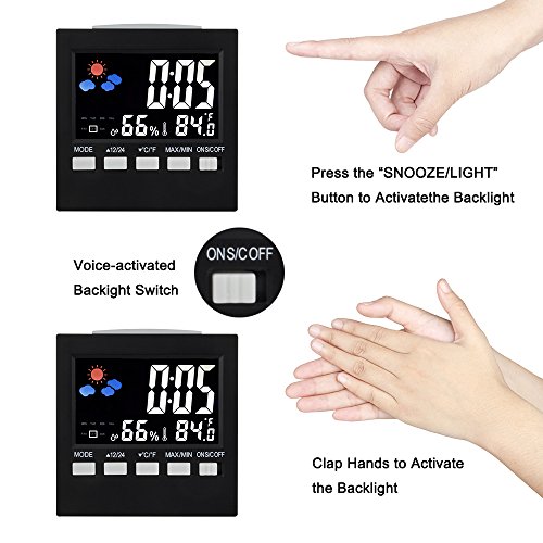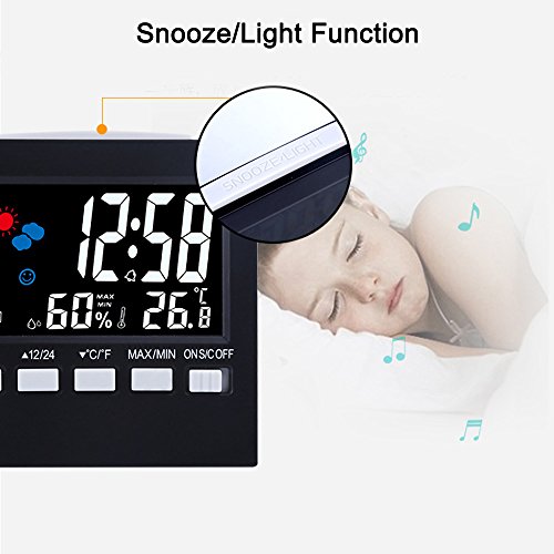 EWTTO Digital LCD Screen Multifunctional Hygrometer Temperature Humidity Meter Alarm Clock Weather Forecast/Date/Day with Sound and Motion Sensor Backlight (Black)