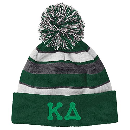Product DescriptionKappa Delta Lettered Comeback Beanie Warm and soft 100% acrylic rib knit Tri-color pom-pom detail on top Folded hem Fit type: One size - Great cute Greek font.0