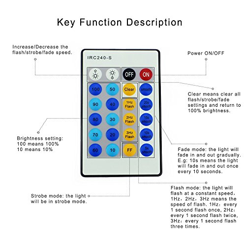 Multi-function remote controller lets you control the light remotely with 10 brightness levels. Also includes 3 different modes for adjustable settings: flash / strobe / fade.