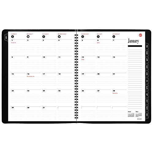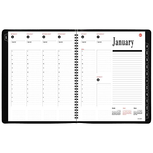 -. Feature : 800 range appointment book / planner lets you enjoy versatile monthly and weekly planning with plenty of note space. 12 month date range covers a full calendar year from January - December. Julian dates. / Weekly spread covers two pages with a large side column for notes and past, current and future months reference calendars. / Each week day, Monday - Friday, is broken down into column-style hourly appointments from 7:00 a.m. - 7:00 p.m. Weekends and evenings are lined and untimed. / Tabbed, monthly calendar pages are also included to view a whole month at a glance with ruled daily blocks and a column for notes. Past and future months calendar blocks are included on monthly spreads and federal holidays are highlighted for quick reference. / Black, flexible cover is wirebound. P.R.Inted in two colors on improved paper that resists ink bleed* and contains at least 30% post-consumer material. Page size 8.5 in. x 11 in. Overall size is 9 in. x 11.38 in. x .5 in.