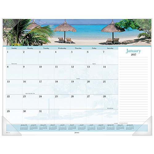 -. Feature : Decorative desk pad gives you a captivating wide-view seaside image across the top of every monthly calendar to escape the everyday. One month per page format features a new sea photograph each month and a complementary background design and color scheme. / Covers 12 months January - December, allowing you to keep a full year's worth of plans in one beautiful place. Julian dates. Sunday - Saturday layout with included ruled column for to-do's and notes. / Large, unruled daily blocks provide plenty of space for notes. Each block is 2.56 in. x 2 in. A full year calendar reference is displayed along the bottom of each month for quick and easy reference at a glance. / Three bonus pages include current yearly reference calendar, future yearly reference calendar and a dates to remember page / Durable backboard provides sturdy writing surface to protect your desk and four clear, poly corners ensures pages stay flat. Page size: 22 in. x 17 in. Overall size: 22 1 / 6 in. x 17.13 in. x .13 in. Quality paper contains 30% post-consumer material