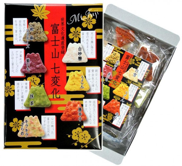 | 世界文化遺産登録された富士山をかたちどった、ひとくちサイズのおせんべいです。季節や時間の流れによって変化する富士山の風景を、7種類のおせんべいの味わいと彩りで表現し、おせんべいに風情をプラスしました。 |
