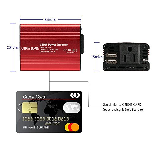 Smart Identification Technology - Provide DC to AC continuous power of 150W and instantaneous peak power of up to 300W. Dual USB ports deliver up to 3.1 amp of power and 1 AC outlet for high-speed charging are perfect for multiple car appliances.Built-in Microcontroller Unit detects the remaining power of your devices and matches optimal current output automatically which helps enlarge the life span of your electrical appliances.It just about Credit Card Size - 3.2 x 2.5 x 1.5 inches.