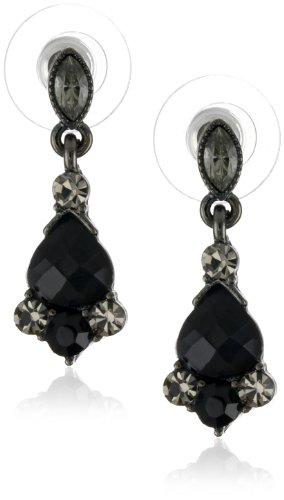With its vintage look these hematite tone drop earrings are ideal for dressing up but they will even work with the most causal of outfits. A marquee shaped simulated Black crystal is used to start the earrings on their posts. Below are faceted jet color teardrops in a hematite tone setting and embellished with simulated black- Pattern crystals above and below giving the appearance of the real thing. 1.1"L x 0.3"WFeature