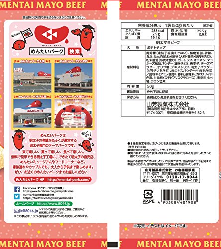 原材料:馬鈴薯(遺伝子組換えでない)、植物油脂、砂糖、食塩、たん白加水分解物(大豆・鶏肉・豚肉を含む)、粉末醤油(小麦を含む)、ガーリック、オニオン、マヨネーズ風味パウダー(卵を含む)、唐辛子、チーズパウダー、オリゴ糖、デキストリン、明太子パウダー(ゼラチンを含む)、肉エキスパウダー(牛肉を含む)/調味料(アミノ酸等)、香料、酸味料、カロチノイド色素、甘味料(ステビア、スクラロース)、香辛料抽出物、ウコン色素