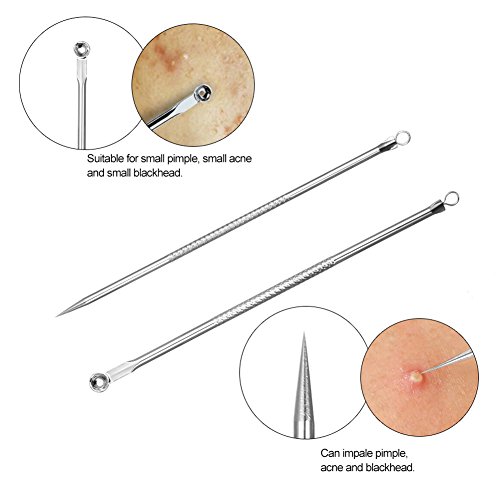 1. Includes 5 different blemish extractor tools for removing blackhead, acne, comdone, pimple, acne, whitehead, zit popper and splinter. It will keep your nose, face clean and smoothwithout redness.