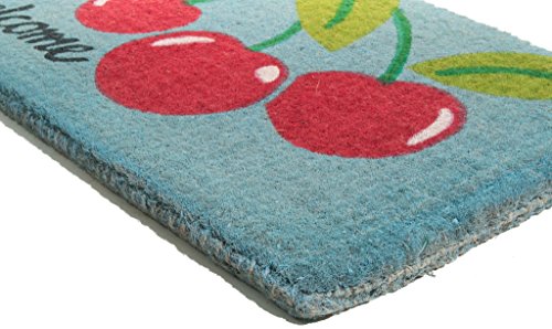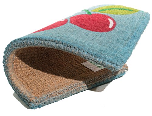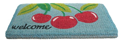 Three bright and cheeful cherries printed on this traditional coir mat welcome guests and brighten any entrance. traditional coir mats are thick and made of very high quality coir naturally bleached with sea water. the design is printed with water based colors, which provide color fastness and brightness. coir fibre is relatively waterproof, has superior scrubbing power and is resistent to the elements. with a coir doormat from imports decor, you can feel confident dirt and debris will be left at the front door and not in your home. item 664tcm.Feature