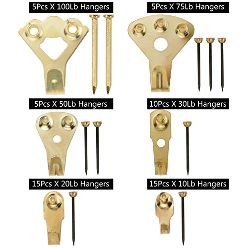 - ❤ Picture Hangers Kit - Come with 130 pieces, which supports various sizes including 10 lbs (15pcs) ,20 lbs (15pcs) ,30 lbs (10pcs) ,50 lbs (5pcs) ,75 lbs (5pcs) & 100 lbs (5pcs) picture hangers and 75pcs nails, its definitely can suit all your needs.