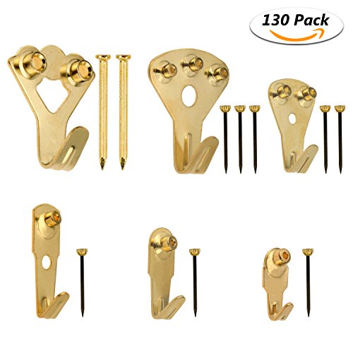 Fixget 130 Pcs Picture Hangers, Picture Hooks Heavy Duty Picture Frame Hangers Picture Hanging Kit with Nails for Wall Mounting, Supports 10-100 lbs, Golden
