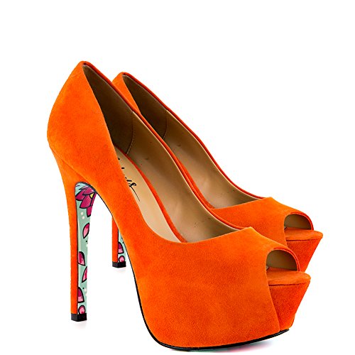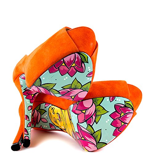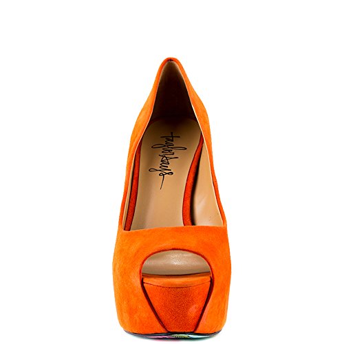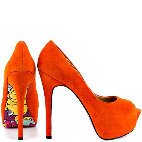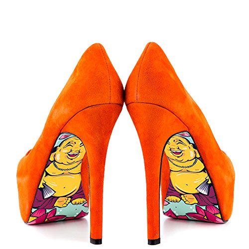 Studio : TaylorSays Publisher : TaylorSays Binding : Apparel Product Description Awaken your fashion spirit in the bright and beautiful Reva by Taylor Says. An enchanting orange suede drapes over the leather upper and silhouette. A smiling Buddha is printed on the bottom of the sole to add luck to every step taken. Last but not least is a 5 1/4 inch stiletto heel and 1 1/2 inch peep toe platform. 0