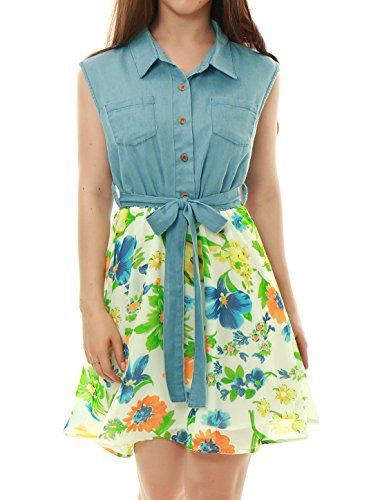 Title : Allegra K Woman Floral Chiffon Panel Belted Denim Shirt Dress White S