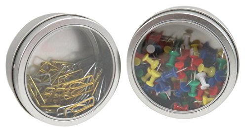 THE SPECIFICS: Set of two magnetic containers measuring 3.5" x 1.5". Paper clips and pins are for demonstration purposes only and not included.