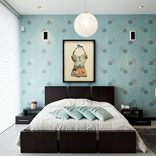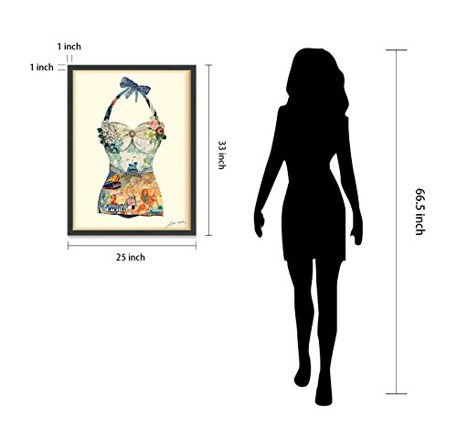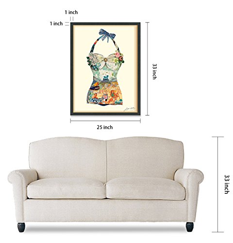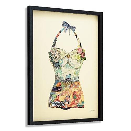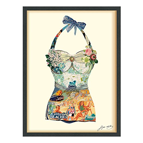 This warm and welcoming image represents a classic one-piece bathing costume, decorated with flowers and images of California. The collage pieces in this image are chosen to complement the whole, calling to mind fun times in the sunshine, or relaxing at the beach. From the blue bow placed at the top to the addition of a shadow section at the bottom, the collage cleverly creates a three-dimensional impression. Lovers of bright, positive imagery and a retro vibe will enjoy this piece.Feature