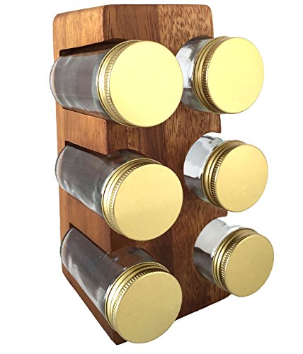 -. Feature : Store your own spices in sustainable style! Made from a warmly finished acacia, this carved wooden spice rack comes with six glass jars, which you can fill with finds from your local spice shop or bulk-bought flavors you love. / The recycled glass jars are topped with gold-hued lids, pairing handsomely with the rich grain of wood that intensifies over time. Also comes with chalkboard labels so you can label or personalized each one specifically. / Whether displayed horizontally or vertically, this spice rack tucks in perfectly with your favorite kitchen tools and culinary must-haves. / Handmade in Thailand. Due to the recycled and handmade nature of this item, each is unique and will vary. Spices not included. Hand wash only. / Dimensions: Acacia Stand with Jars: 3.75" L x 4.5" W x 8" H; 24 oz. capacity. Acacia Stand: 3.75" L x 3.5" W x 8" H. Each Jar: 3.75" H x 1.63" diameter; 4 oz. capacity.
