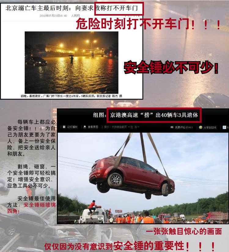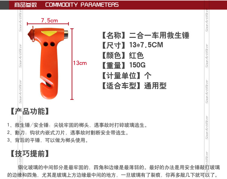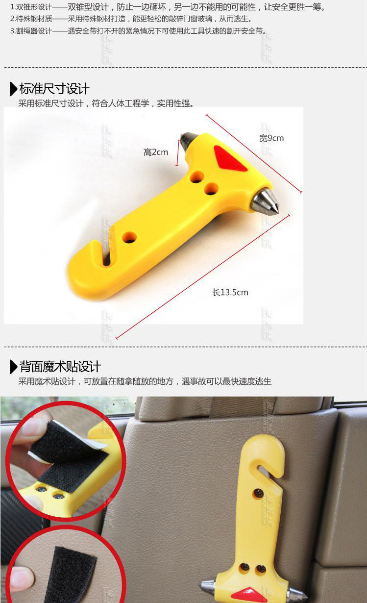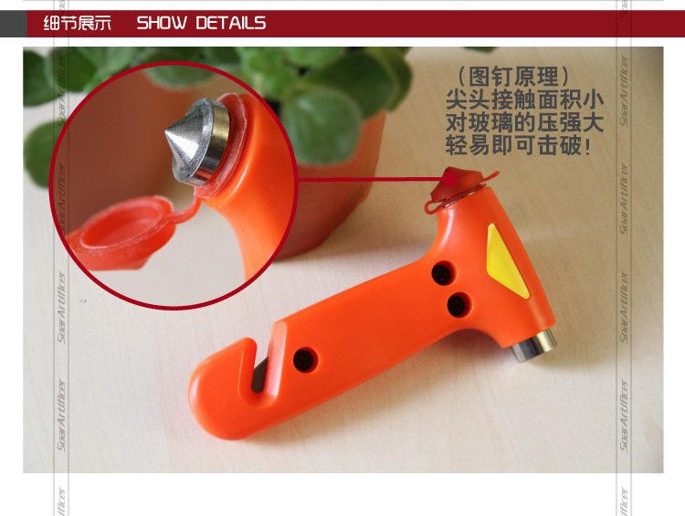1, life-saving hammer / safety hammer: sharp strong hammer, smashed the glass in case of an accident escape.