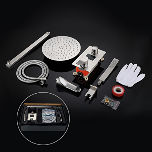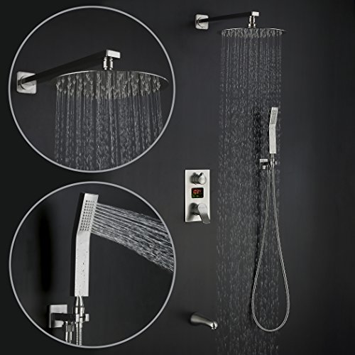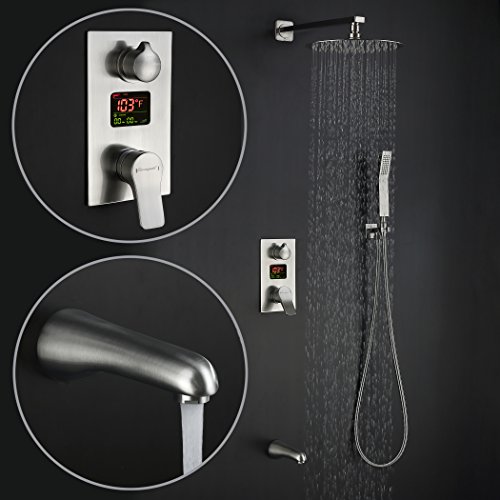 Charmingwater LED Digital Fahrenheit Display Bathroom Rain Mixer Shower Set, 3 Way Shower System with 10in Luxury Rainfall Shower Head, Handheld Shower & Tub Spout Faucet,Wall Mount Brushed Nickel