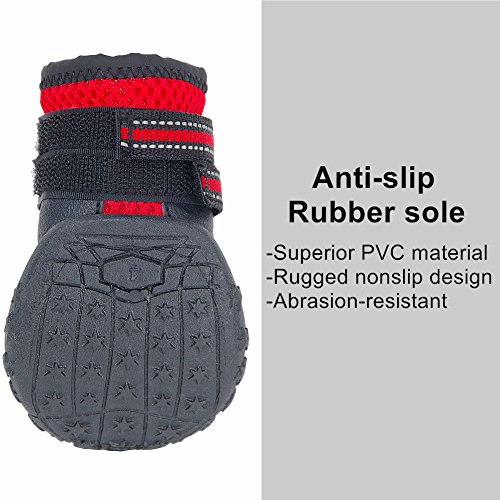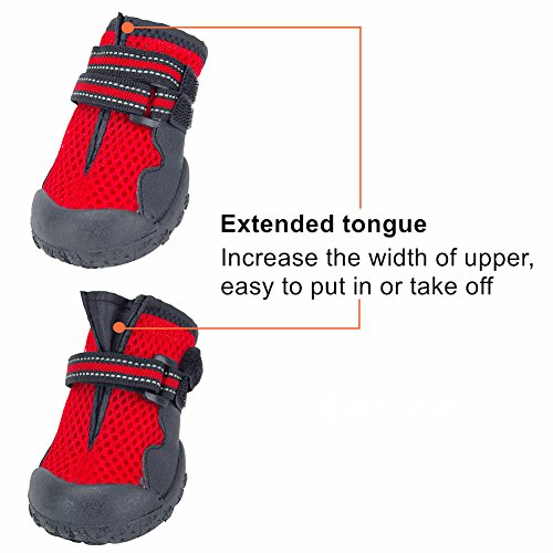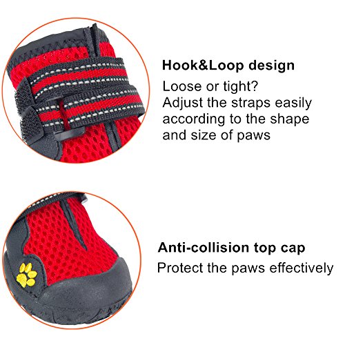 -. Feature : BREATHABLE MESH: mesh material is super breathable and comfortable, specially designed for summer. Prevent the lovely dog's paws from muggy and hot. / RUGGED SOLE: rugged rubber sole is anti-slip and durable. Prevent paws from rubbles, sharp thorns, cold and hot pavement. / TOE CAP: front toe is fully covered by rubber, protecting paws. Suitable for outdoor activity. / MAGIC TAPE STRAPS: magic tape straps are adjustable, convenient to put in and take off. / REFLECTIVE TAPE: reflective tape design keeps your pet safe in dark.