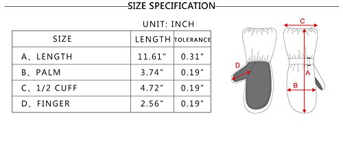 Our children's winter mittens offer outstanding protection from snow, wind, and rain, so kids can play outside, worry free. Warm Heat Insulation Cotton, fleece liner, make sure each pair gloves so that heat stays in, and moisture stays out - plus, it's breathable to prevent heat loss due to perspiration, and to keep the mittens comfy enough for your kids to wear all day long. Suitable for participating in outdoor sports such as skiing, snowboarding, mountaineering, rock climbing, hiking, and more. Materials: Polyester Shell; Warm Heat Insulation Cotton, fleece liner. One Sizes for 3-10 years old kids: Measure kids' hands and match to the ranges below: Length: 11.3"-11.6" from bottom of palm to fingertips Palm: 3.5"-3.7" Woven Cuff: 9.44" Thumb: 2.56" Package Includes: 1 x Pair Kid's Snow Mittens 0 |