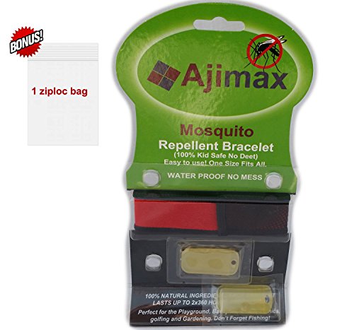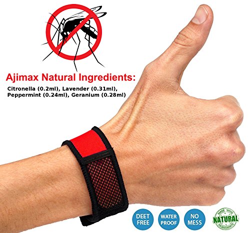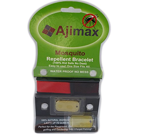 -. Brand : Ajimax -. Color : Red -. EAN : 0635833219338 -. Feature : ✔ MADE WITH QUALITY MATERIAL: Manufactured with high-quality and comfortable fabric. / ✔ NO SPRAY TECHNOLOGY: No more having to spray yourself or your loved ones. / ✔ PEST REPELLER WITH NATURAL INGREDIENTS: 4 Essential Oils -Citronella (0.2ml), Geranium (0.28ml), Peppermint (0.24ml), Lavender (0.31ml) / ✔ 2 FREE REFILLS: Comes with 2 refills for 30 days or more. / ✔ OUTDOOR PROTECTION: Worried about going outside because of the insects? -. Label : Ajimax -. Manufacturer : Ajimax -. PackageQuantity : 1 -. ProductGroup : Lawn & Patio -. ProductTypeName : OUTDOOR_LIVING -. Publisher : Ajimax -. Size : 5 x 2 x 9 inches ; 1.6 ounces -. Studio : Ajimax -. Title : Mosquito Repellent Bracelet By Ajimax, with 2 Free-refills 1 Bonus Ziploc Bag No-spray, No-liquids, No-mess, No-deet, 24hr Protection for Everyone Against Insect Bites -. UPC : 635833219338