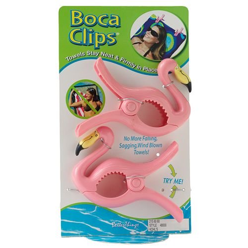 This Boca Clips beach towel clip set will become a favorite. Featuring an adorable Flamingo design, these clips combine function with fashion. Ejoy Boca Clips on the beach or poolside all year long. Also a great clip for chip bags etc.