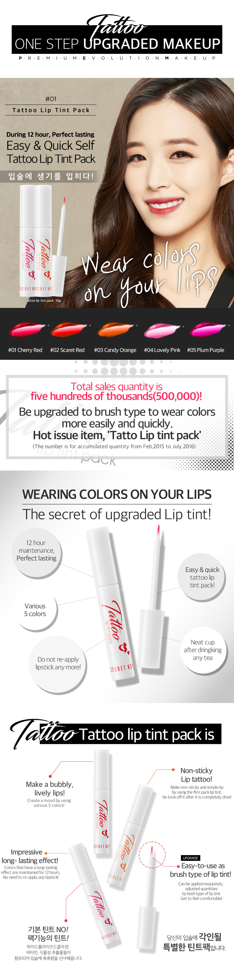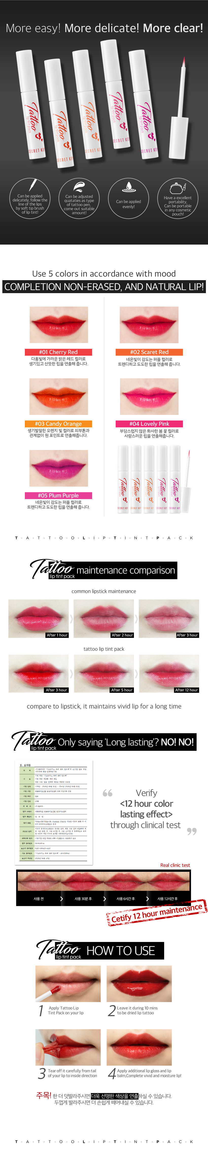 01) Apply Tatoo Lip Tink Pack on your lip. 02) Leave it during 10mins to be dried lip tatoo. 03) Tear off it carefully from tail of your lip to inside direction. 04) Apply additional lip gloss and lip balm, Complete vivid and moisture lip!