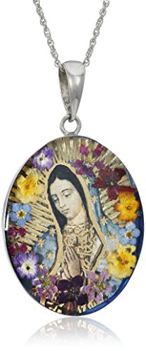 Sterling Silver Virgin Mary of Guadalupe Pressed Flower Pendant Necklace, 18"