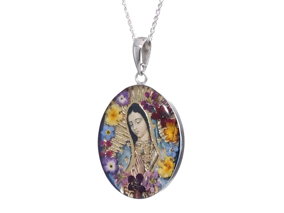 Unique oval-shape pendant featuring the Blessed Mother, Mary, and real dried flowers preserved in resin and surrounded by sterling silver settings