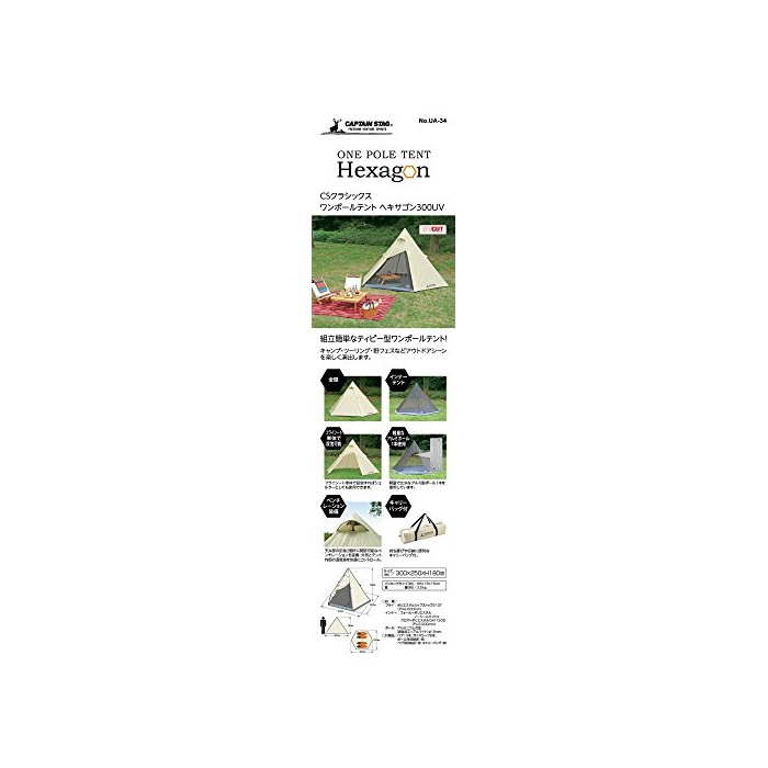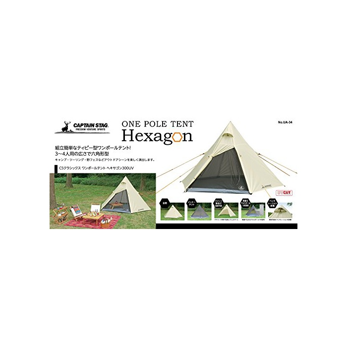 원본상품명: キャプテンスタッグ テント ワンポルテント ヘキサゴン ティピ型 3~4人用 【サイズ300×250×H180cm】 UVPU加工 キャリバッグ付き CSクラシックス UA-34