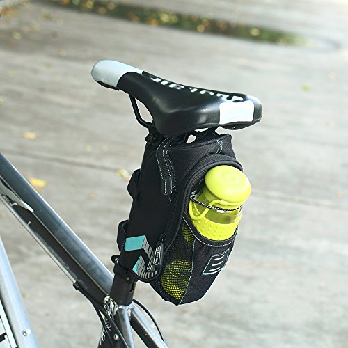 FeatureDesigned for saddle post installing.Suitable for keeping bicycle repair tools also come with a water bottle pocket and a tail light ring.Whole body waterproof with rainproof zippers.Ultralight bike saddle bag. Size :9.4*3.7*3.5" inSuitable For : Mountain Bike , Road BikeColor : BlackWeight :0.4 lbBest Gift For you and your friends Package Include:1 x Bicycle saddle Bag