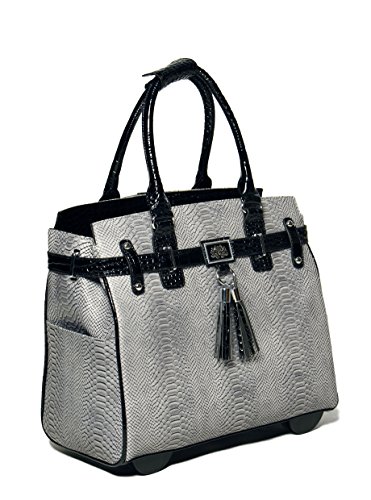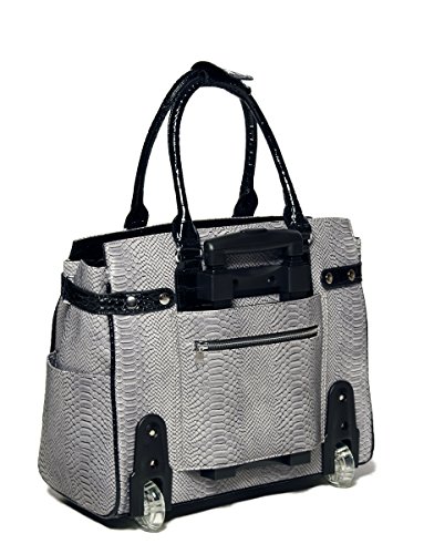 -. Binding : Electronics -. Brand : JKM and Company -. Color : Grey, gray, black -. EAN : 0799207241414 -. Feature : Carry-on size for most airlines. Ladies grey python faux leather exterior with black faux alligator trim and accent belt. Stylish rolling tote bag or carryall holdall bag. / Expansion snaps for those days when you have more to carry. Silver tone hardware plus lovely lotus flower pendant. Two tassel accents plus two convenient side pockets. / Removable padded interior pocket will fit your tablet, iPad, 12", 13", 14", 15, 16" or 17" inch laptop (measured corner to corner diagonally). / Fully lined interior with zipper pocket and two open pockets. Zipper top closure. Exterior back side zipper pocket. / Pull out retractable handle plus durable wheels for easy mobility wherever you may travel. Bag measures approx. - 16.5" Long x 15" High x 8" Wide/Deep. -. Label : JKM -. Manufacturer : JKM -. Model : 5773867 -. MPN : 5773867 -. PackageQuantity : 1 -. PartNumber : 5773867 -. ProductGroup : PC Accessory -. ProductTypeName : COMPUTER_COMPONENT -. Publisher : JKM -. Studio : JKM -. Title : "The Posh" Python & Alligator Computer iPad, Laptop Tablet Rolling Tote Bag Briefcase Carryall Bag -. UPC : 799207241414