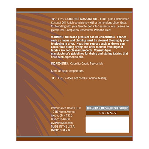 Studio : Bon Vital' Publisher : Bon Vital' Binding : Misc. Product Description Bon vital, the #1 preferred brand of massage Therapists focusing on professional quality products, brings you a line of premium massage products enriched with Pure 100 percent fractionated coconut oil that can be used for all massage modalities and techniques. The bon vital coconut line of creme, lotion, gel, and oil leverages the benefits of 100 percent Pure fractionated coconut oil to provide intense hydration to dry skin. The unscented, water-dispersible formula is ideal for blending with bon vital essential oils to create the ultimate Aromatherapy massage experience. 0