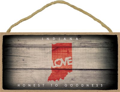 (SJT13547) Indiana - State Outline With "Love" And State Motto 5" x 10" Wood Plaque Sign
