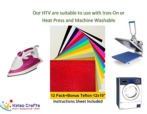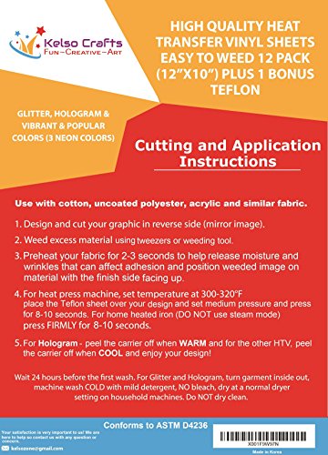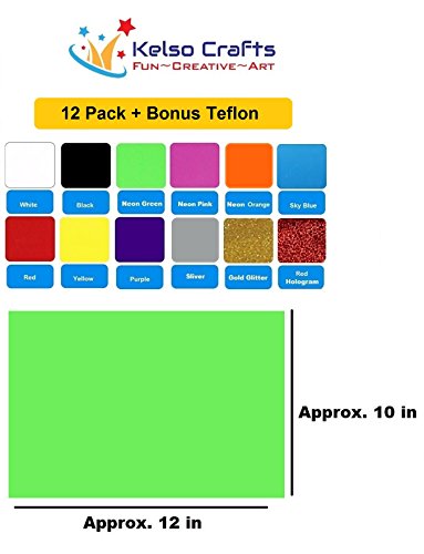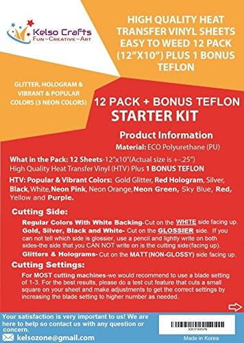 - STARTER KIT INCLUDES: 12 Sheets + 1 BONUS Teflon-12”x10” Easy Weed Heat Transfer Vinyl Sheets HTV of Popular & Vibrant Colors: Red Hologram, Gold Glitter, Silver, Black, White, Neon Green, Neon Pink, Neon Orange, Sky Blue, Red, Yellow, and Purple.