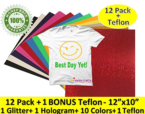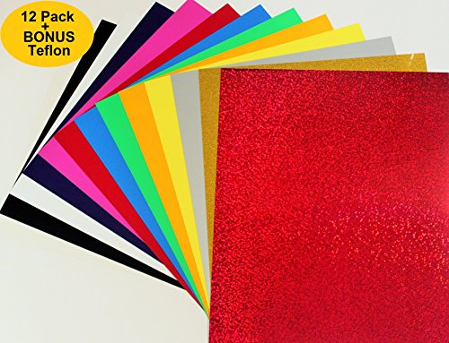 12 Pack +BONUS Teflon Easy Weed Heat Transfer Vinyl Sheets Bundle 12”x10"-1 HOLOGRAM+1 GLITTER+10 Colors HTV - T-Shirts, DIY Crafts, Silhouette Cameo, Cricut Vinyl, Heat Press Machine, Iron On
