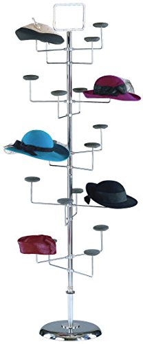 Studio : Marvolus Manufacturing Publisher : Marvolus Manufacturing Product Description Show off your best women's hats in style with this polished, all-chrome floor display. The best part is that the 10-tier design better preserves your hats with special foam-covered hat holders that can hold 20 hats of all sizes. And this display is unique because it spins as one unit to prevent your hats from getting damaged. Includes heavy-weight round base and framed sign holder. Overall Dimensions: 72" high with a 20.5" spinning diameter. Please note that the maximum number of items that can be ordered is 25 per customer. 0