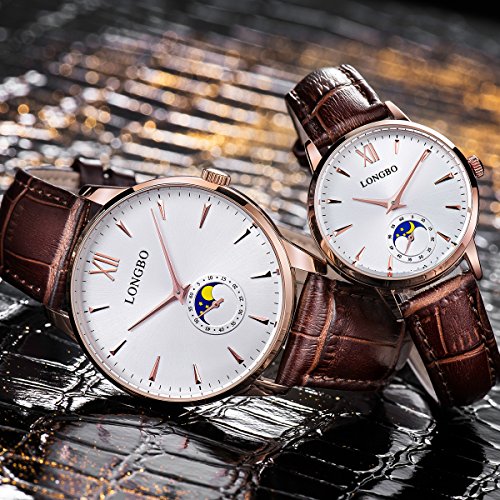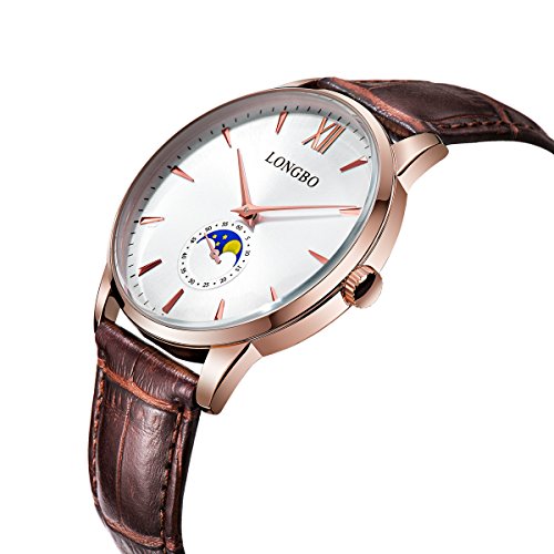 -. Binding : Watch -. Brand : LONGBO -. Department : womens -. Feature : Precise Time Keeping / Suitable For Wear In Business(This is Women Watch) / Elegance Style With Genuine Leather Strap/Charming Design Roman Dial / Original Quartz Movement Business Casual Combine,Sun And Moon For Decorative / This is a perfect casual and simply watch for you. Also make it a great gift for family or friends or lover -. Label : LONGBO -. Manufacturer : LONGBO -. MPN : 5008L-RG0105 -. PackageQuantity : 1 -. PartNumber : 5008L-RG0105 -. ProductGroup : Watch -. ProductTypeName : WATCH -. Publisher : LONGBO -. Studio : LONGBO -. Title : LONGBO Casual Women's Rose Gold Plated Sun Moon Phase Roman Numeral Business Watch Brown Leather Band Dress Wristwatch Waterproof Date Watches